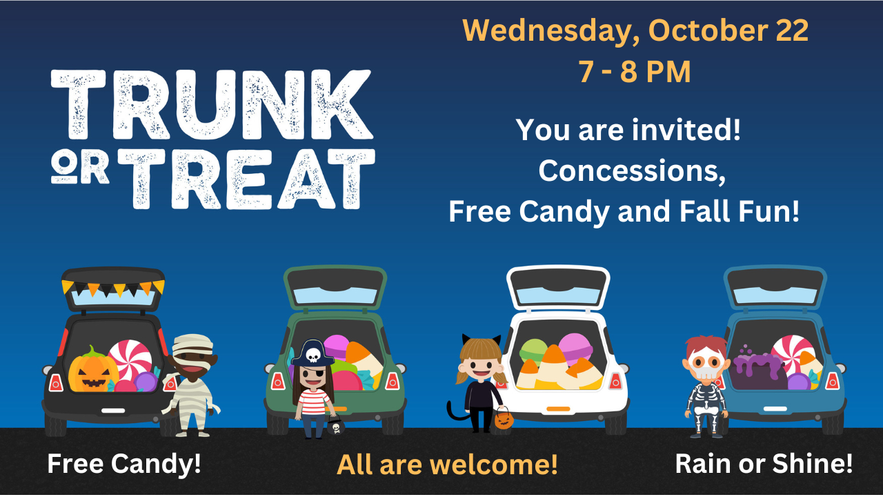 Join us for Community of Hope’s Trunk or Treat! We’ll have a whole row of decorated cars lined up for you and your family to “Trunk or Treat”, as well as some music, fun games, and concessions! Family friendly costumes are welcome!